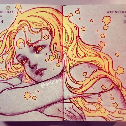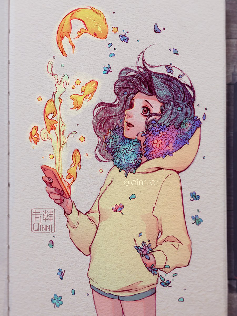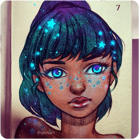I like Quinni's art style as she uses different techniques to make things appear to glow. She uses cartoon/anime style in her characters with large eyes.